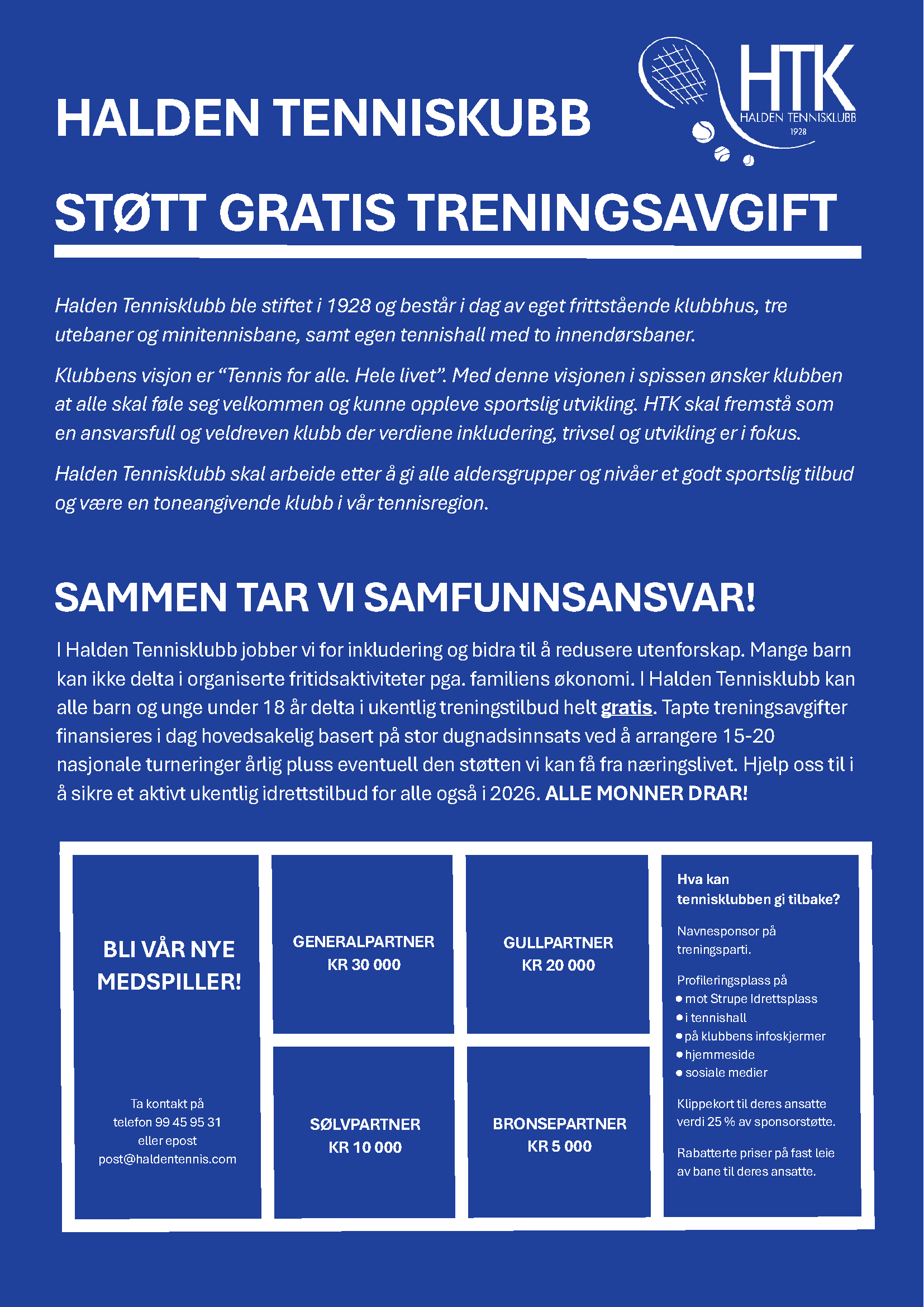 Styret i Halden Tennisklubb innkaller herved til årsmøte. Dato: Mandag 30. mars 2026 Tid: 18:00 Sted: Halden videregående skole Saker som ønskes behandlet på årsmøtet må sendes skriftlig til styret